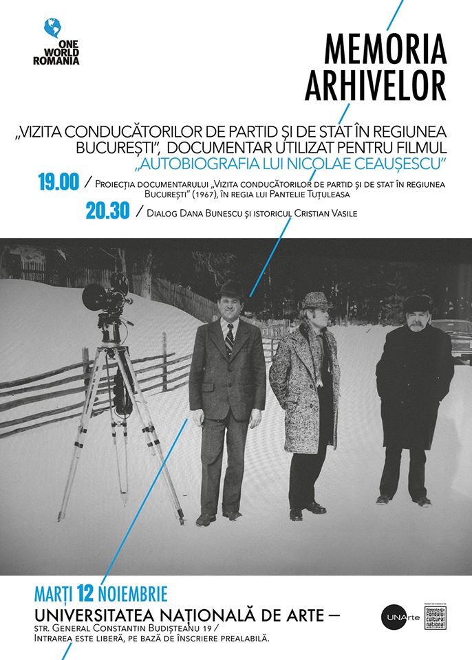 Marți, 11 noiembrie, de la ora 19, în sediul din str. General Constantin Budișteanu 19 al Universității Naționale de Artă, Dana Bunescu va prezenta documentarul din 1967, „Vizita conducătorilor de partid și de stat în regiunea București”, în regia lui Pantelie Tuțuleasa, care a fost utilizat de ea și de Andrei Ujică pentru „Autobiografia lui Nicolae Ceaușescu”.