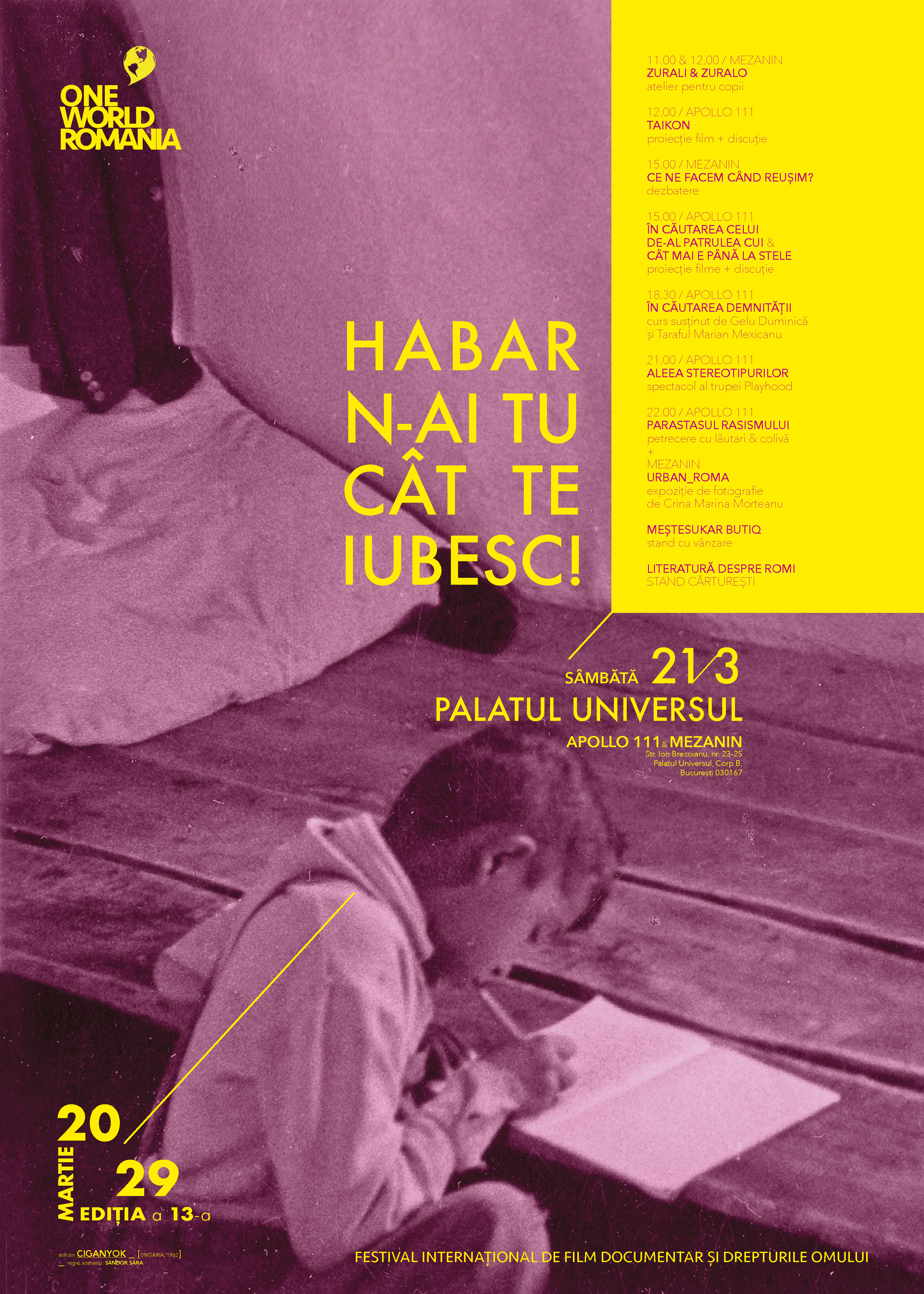 Secțiunea principală a ediției de anul acesta a festivalului One World Romania, care va avea loc între 20 și 29 martie la București, va fi dedicată minorității rome, cu ocazia unui moment simbolic în istoria mentalităților în societatea românească: în sfârșit, după mai bine de un secol și jumătate de la desființarea robiei, cei care și-au eliberat mintea de stigmata față de romi i-au depășit ca pondere pe cei care încă nu îi acceptă ca egali în societate. Vom celebra și vom analiza trecerea acestui prag printr-o serie de proiecții de filme de și despre romi și printr-o zi întreagă dedicată acestei teme importante, sâmbătă, 21 martie, la Palatul Universul.