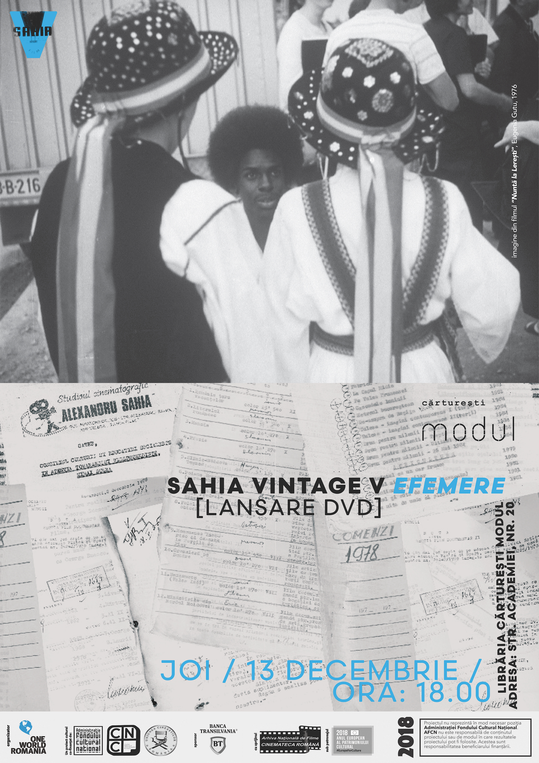 Joi, 13 decembrie, ora 18:00, lansăm DVD-ul SAHIA VINTAGE V: efemere, cu proiecția unuia dintre filmele recent descoperite la Arhiva Națională de Filme: Cum circulăm? (Slavomir Popovici, 1963, 16’), un exercițiu ludic de virtuozitate regizorală dezvoltat pe baza unei comenzi a Direcției Generale a Miliției Capitalei – un film care vorbește simultan despre Bucureștiul anilor ‘60 și despre afinitatea regizorului pentru avangarda cinematografică.
