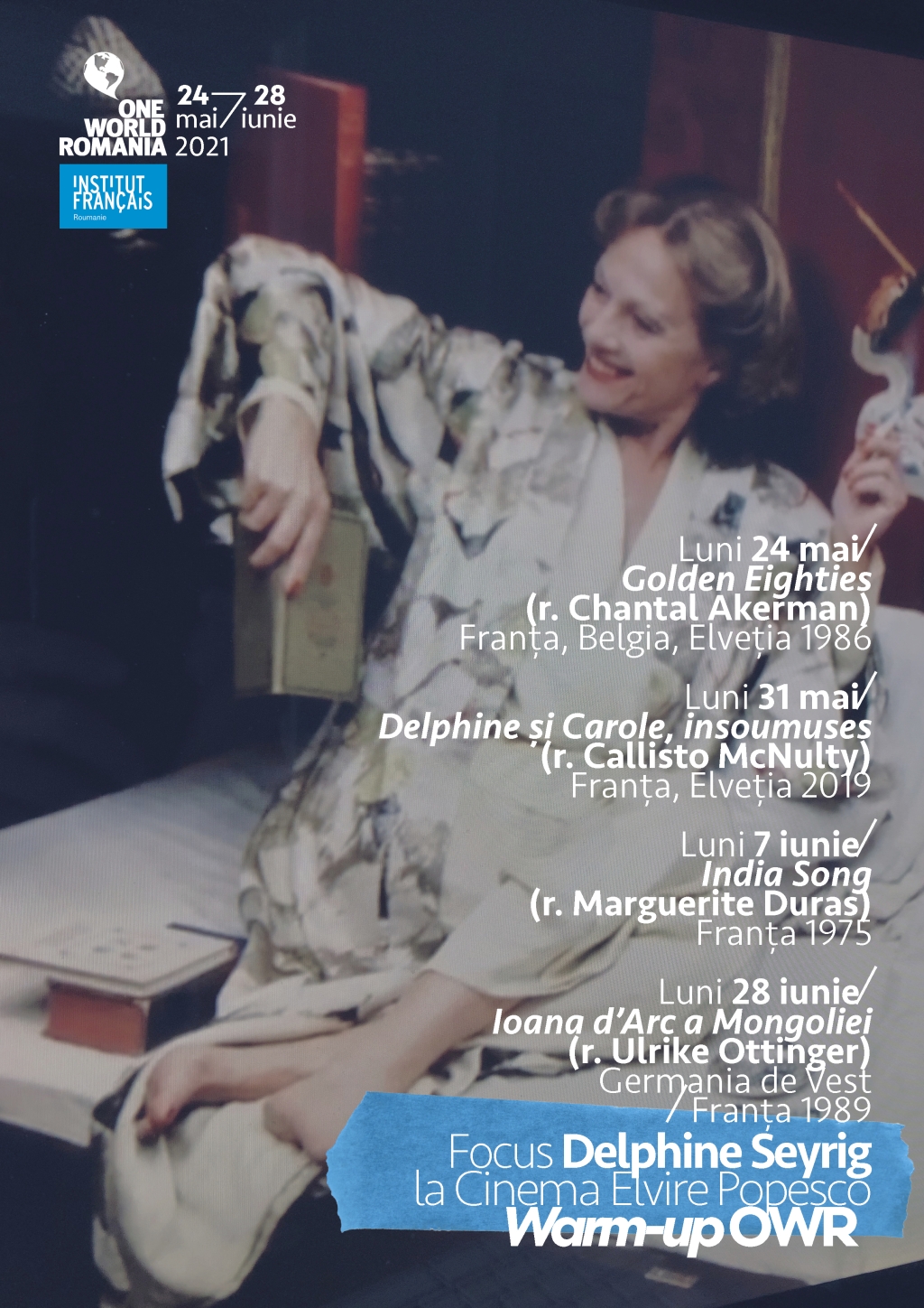 În pregătirea celei de 14-a ediții a festivalului, One World Romania, împreună cu Institutul Francez și cu Institutul Goethe din București, vă invită în lunile mai și iunie la o incursiune alături de marea actriță Delphine Seyrig în cinematograful feminin al anilor ’70 și ’80, urmând ca în timpul festivalului, între 11 și 20 iunie, să aducă un omagiu activității sale de cineastă dedicată cauzei feministe, într-o perioadă în care mișcarea avea nevoie de personalități celebre în prim-plan.